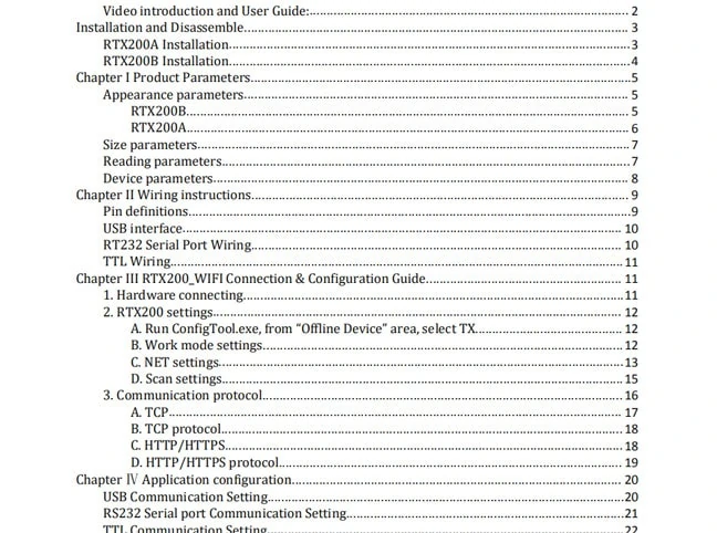 We provide a detailed user guide for Wiring instructions, WIFI Connection & Configuration, Communication protocol... which helps you to configure and install the scanner more easily.