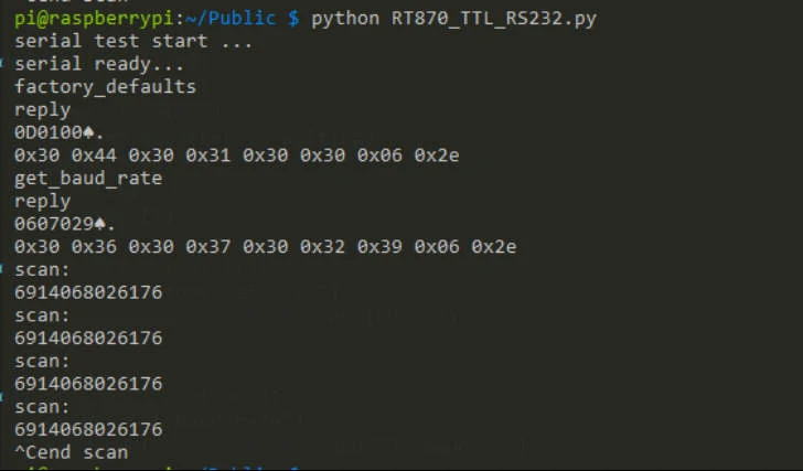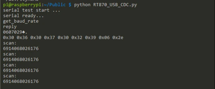 If we want to use the USB port and make it work as a virtual serial port, set up the RT870 to USB Com port emulation mode. And the RT870 scanner will be detected as a COM device in Raspberry Pi.