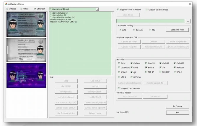 IDe200 captura imágenes a todo color y también imágenes ultravioleta (UV) e infrarrojo (IR) de la tarjeta de identificación,  cédula / Carnet de identidad o la licencia de conducir.