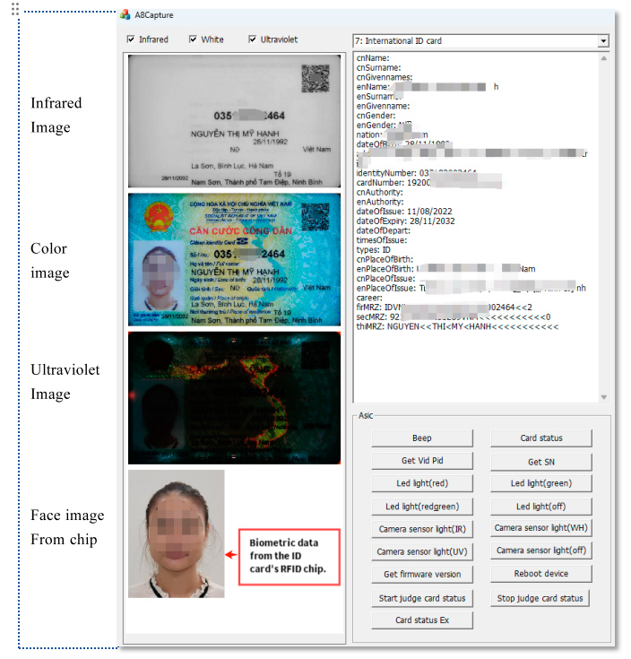 1. Pick up name, ID number, etc. from MRZ data. 2. Decode bar codes. 3. Get original or cropped images. 4. Get ID information from NFC chip or Smart card, etc.