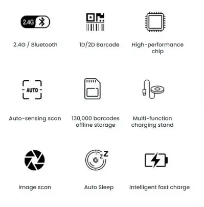 Conexión⌨️ USB ⌨️ 2.4G inalámbrico ⌨️Bluetooth ⌨️Base de carga inteligente | Funciones Principales✔️Código de barras 1D&2D (QR DM Aztec) ✔️Batería de alta capacidad de 2000mAh ✔️Beeper & Vibración ✔️Base de carga inteligente 3-en-1 |