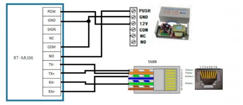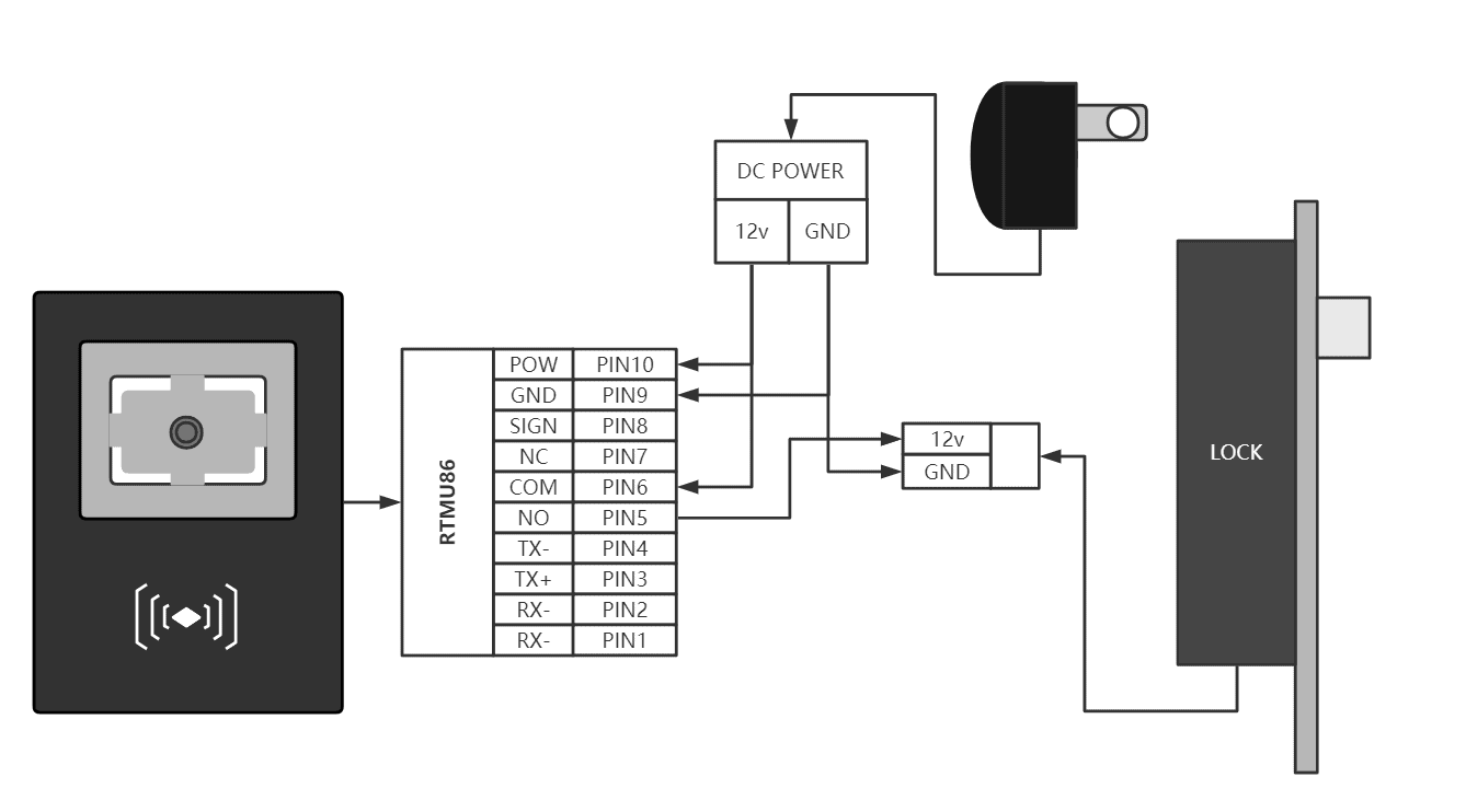 12V is connected to the RTMU86 com terminal input, and NO is connected to the positive pole of the electromagnetic lock power supply. After mu86 receives the unlock command, the com and no ports are turned on, and the electromagnetic lock is energized and unlocked.