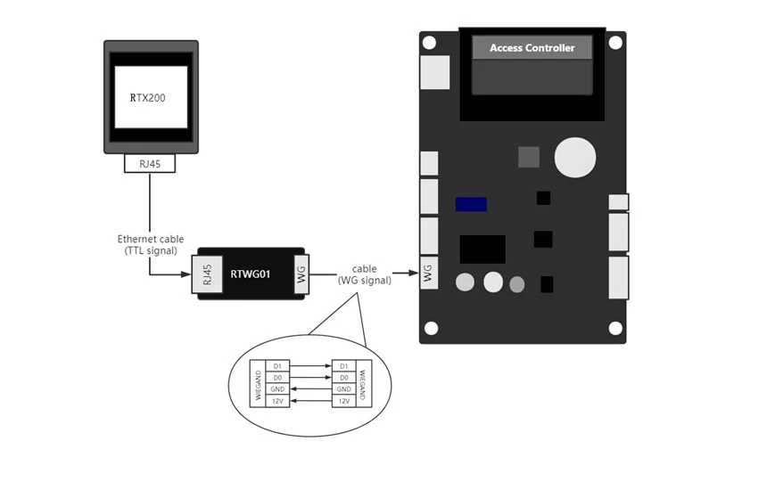 Fixed-mount designed, Can be used for terminals like turnstiles. RTX200 outputs Wiegand signal via RTWG01 and works with the Access control system.