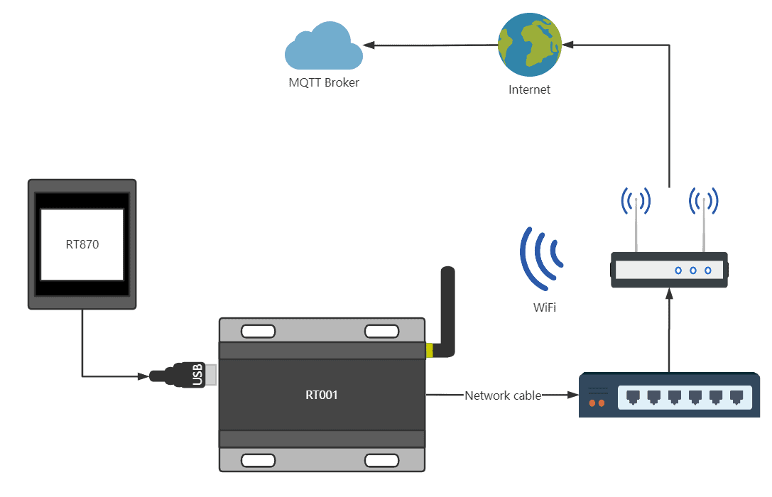 The barcode scanner is connected to RT001 via a USB cable, and RT001 is connected to the router via WIFI or Ethernet (or connected to table/cell phone terminals via Bluetooth). And then transfer to read data to the MQTT topic via remote MQTT server by the Internet.