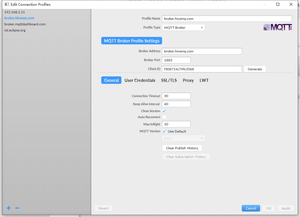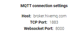 Here we use the broker.hivemq.com server, the official website is http://www.mqtt-dashboard.com/, the MQTT TCP port is 1883, and the MQTT WebSocket port is 8000