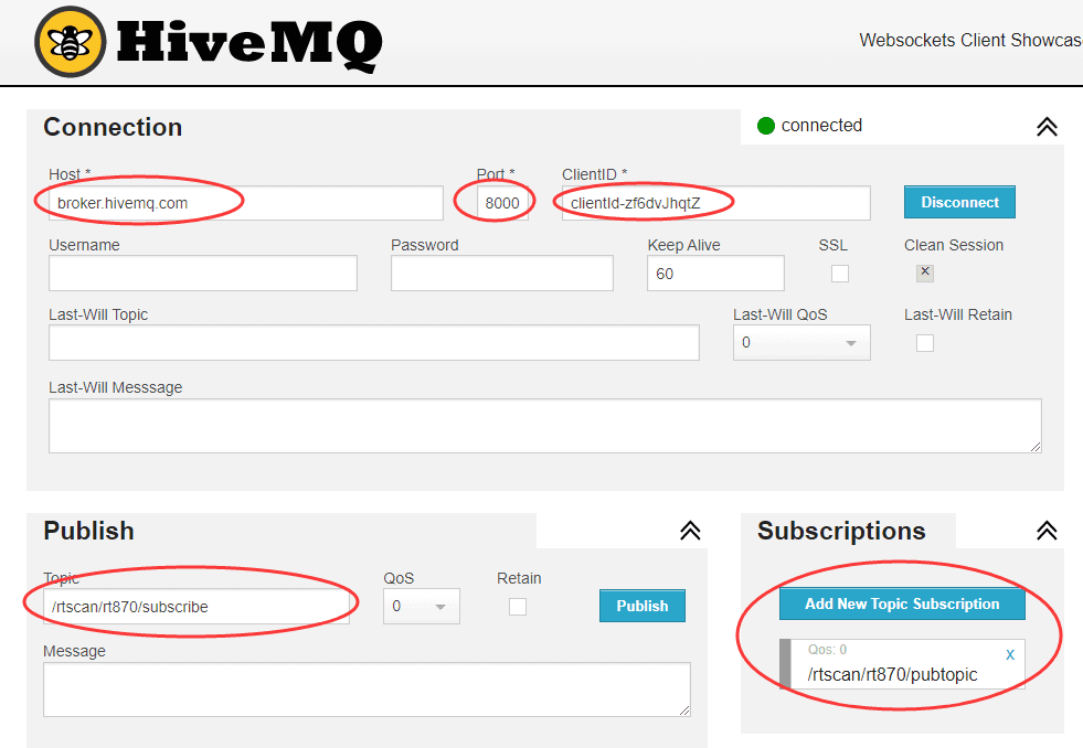 Subscribe to the topic published by the device after connection /rtscan/rt870/pubtopic